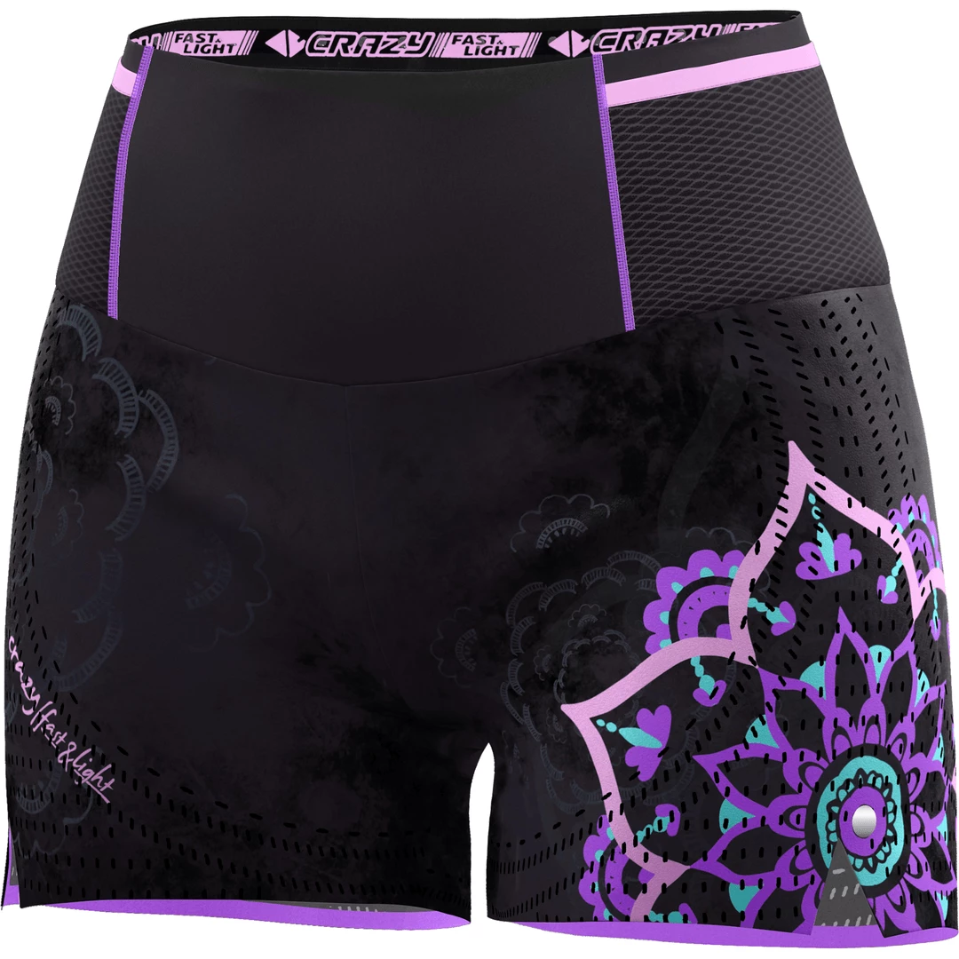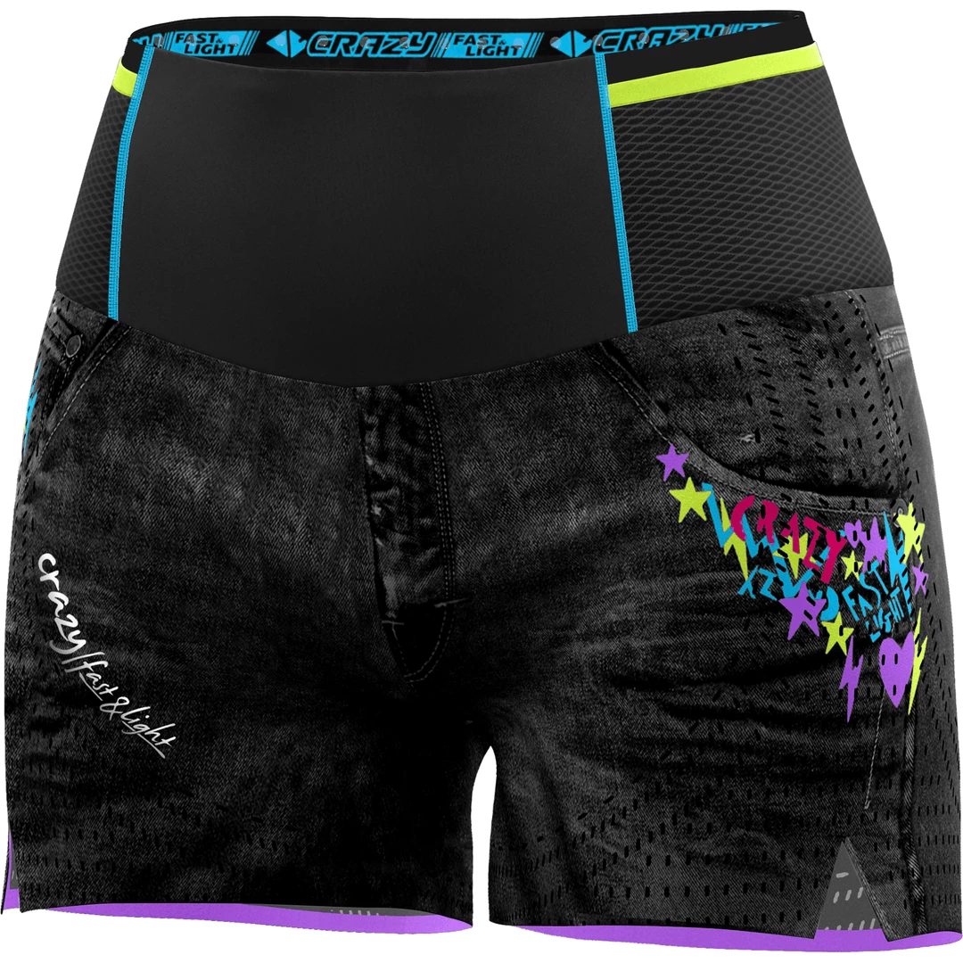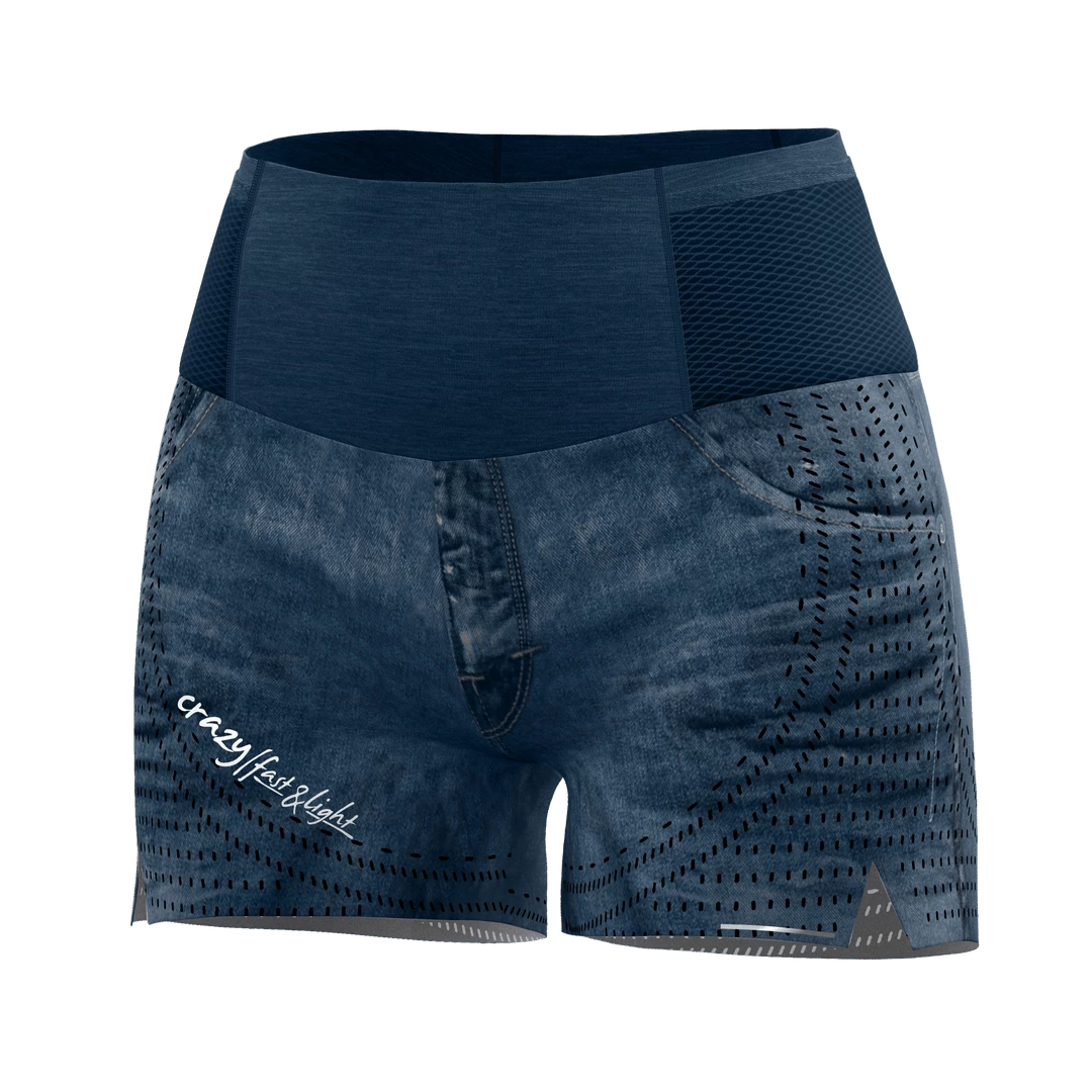 Designed for ultimate lightness and freedom of movement, the Crazy W Short Lightning is a minimalist running short designed to tackle high ridges, technical terrain, and long stretches of uninterrupted trail. The Short Lightning is made of a quick drying, bi-elastic fabric with laser cut perforations for added breathability. The high waist band has secure pockets to hold gels, snacks, or other run essentials. Most importantly, the Lightning has supremely comfy, raw cut inner underpants that won’t chafe on even the most grueling days. The Lightning short is ready to chase PRs and eat up the miles, and with the signature Crazy style, you’ll stand out not only for your speed, but also for crossing the finish line in jorts.