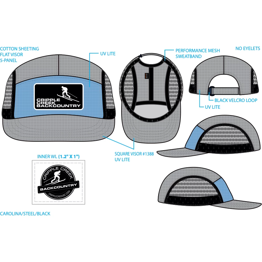 A Fantastic runner hat with Cripple Creek custom cotton twill patch sewn on the front. Uphill Skiing for the win!