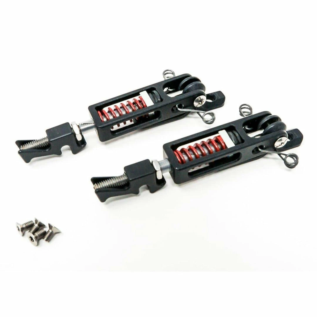 Provides increased forward (toe side) flex via a swappable spring with 1/2” of travel and backward (heel side) damping via a rubber shock with ~1/8” of travel.